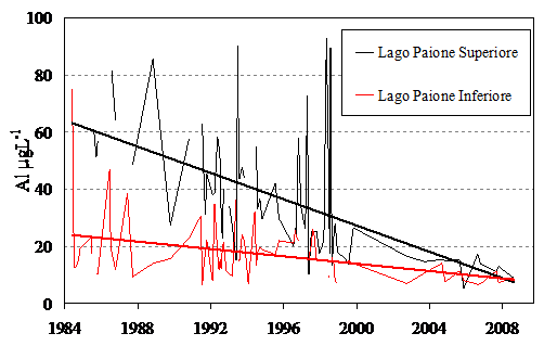 Fig. 41 Evoluzione temporale delle concentrazioni di alluminio (µgL-1) nei laghi Paione. |