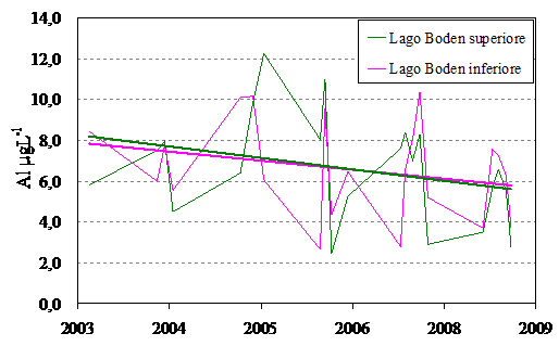 Fig. 42 Evoluzione temporale delle concentrazioni di alluminio (µgL-1) nei laghi Boden. |