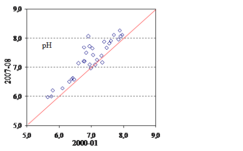 Fig.43 Confronto dei dati di pH delle due campagne di campionamento del 2000-2001 e 2007-2008 dei laghi alpini della Val Sesia e Ossola. |