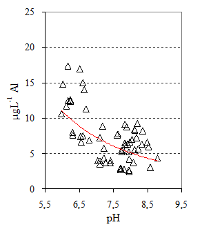 Fig. 43 Concentrazioni medie di alluminio in μgL-1vs pH nel triennio 2006-2008 |