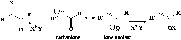 Gli enolati sono nucleofili bidentati (hanno carattere nucleofilo sia sull'atomo di carbonio e che sull'atomo di ossigeno).