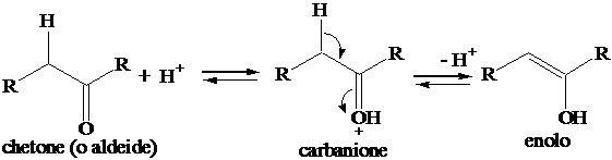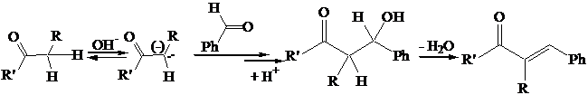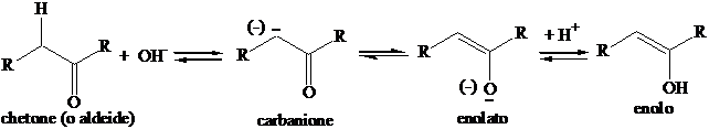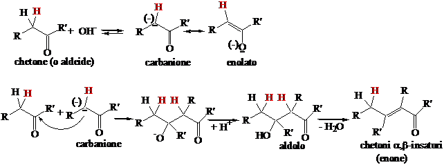In ambiente basico lo ione enolato formatosi attacca l'atomo di carbonio carbonilico di una molecola di aldeide (o chetone), presente in grande eccesso. Si forma un aldolo. Se sono presenti 2 atomi di idrogeno in a si ha successiva eliminazione di acqua (condensazone) con formazione di un enone.
