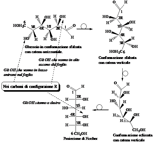 La rappresentazione degli zuccheri secondo Fischer mostra la proiezione sul piano della molecola in conformazione eclissata. La catena degli atomi di carbonio è verticale. I legami CC, verticali, entrano dentro il foglio, mentre i legami C-H e C-OH, orizzontali, escono dal foglio. Nelle proiezioni di Fischer gli OH dei carboni di configurazione R stanno a destra (ovviamente, gli OH dei carboni di configurazione S stanno a sinistra