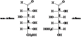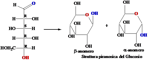 La ciclizzazione degli zuccheri avviene attraverso la formazione di un legame emiacetalico tra un OH e il gruppo carbonilico, portando a una struttura a 5 termini (furanosica) o a 6 termini (piranosica). La ciclizzazione avviene quando il gruppo OH è perpendicolare al piano del carbonile. Nella proiezione di Fischer questa conformazione corrisponde al legame OH rivolto in basso.