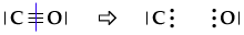 Si confronta poi la configurazione elettronica così ottenuta con quella naturale dell'atomo. Nel nostro caso, il carbonio verrebbe ad avere 5 elettroni nello strato di valenza, uno in più rispetto alla configurazione normale. È come se avesse acquistato un elettrone e gli assegneremo pertanto una carica negativa. Analogamente, l'ossigeno verrebbe ad avere 5 elettroni, uno in meno rispetto alla configurazione normale. È come se avesse perso un elettrone e gli assegneremo pertanto una carica positiva.