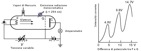 Del 1914 sono gli esperimenti condotti da J. Franck e G. Hertz (nipote di H. Hertz) i quali scoprirono che gli elettroni, quando attraversano i vapori di Mercurio, subiscono una perdita di energia secondo "livelli" discreti e che a tale perdita di energia corrisponde una emissione di radiazioni ultraviolette ( = 254 nm) da parte del Mercurio. Pochi mesi più tardi Niels Bohr si rese conto che si trattava di una chiara conferma della validità del suo modello atomico quantizzato.