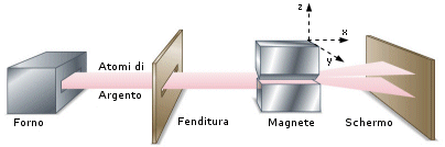 Un fascio di atomi di Argento attraversa un campo magnetico fortemente disomogeneo. I poli del magnete sono stati sagomati in modo che sul fascio di atomi agisca una forza deviante costante solo in direzione z e nulla in x ed y. Gli atomi si dividono in due fasci, colpendo lo schermo in due punti disposti simmetricamente rispetto alla direzione originaria. Gli atomi dimostrano pertanto di possedere un momento magnetico netto che si orienta in due soli modi possibili e controversi (spin antiparalleli) rispetto al campo magnetico applicato.
