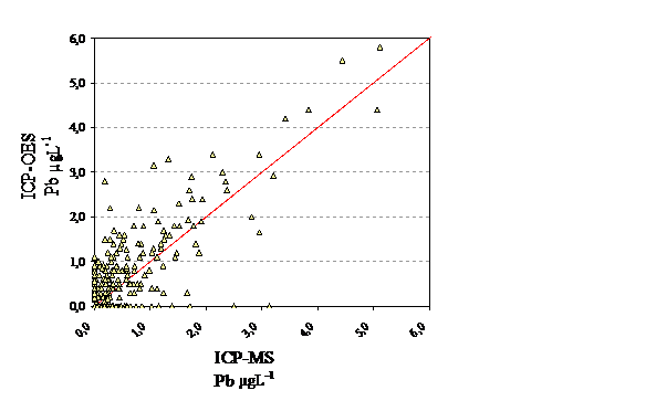 In figura 30, è riportato graficamente, a titolo di esempio, il confronto tra ICP-OES e ICP-MS nel caso della variabile piombo. Come si osserva vi è una generale discreta correlazione tra le due metodiche (R2 = 0,5877).