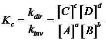 dove le concentrazioni sono sempre le concentrazioni delle specie chimiche all'equilibrio e Kc (kappa-ci), essendo ottenuta come rapporto di due costanti (costante di velocità specifica inversa e diretta) è una nuova costante, detta costante di equilibrio. Il suo valore è caratteristico per ogni reazione e varia solo in funzione della temperatura, mentre è indipendente da ogni altra condizione (pressione, concentrazione, catalizzatori etc).