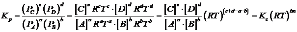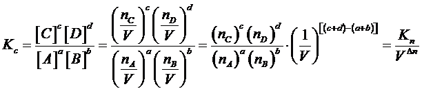 Dove Δn è la differenza tra i coefficienti stechiometrici dei prodotti di reazione e i coefficienti stechiometrici dei reagenti. Tale relazione ci permette di affermare che, per una medesima reazione, il valore di Kc coincide con il valore di Kp solo se reagenti e prodotti sono presenti con lo stesso numero di moli.
