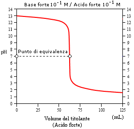 La curva di titolazione di una base forte (analita) con un acido forte (titolante) presenta un andamento speculare rispetto a quella acido-forte/base-forte, con il punto di equivalenza in corrispondenza del flesso (cambiamento di pendenza della curva da positiva a negativa) a pH = 7.