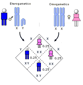 Nella specie umana esistono 23 coppie di cromosomi. 22 sono formate da cromosomi uguali (autosomi) e una coppia dai cromosomi sessuali. Le femmine possiedono due cromosomi sessuali uguali (due cromosomi X), mentre i maschi hanno due cromosomi sessuali diversi (un cromosoma X ed un cromosoma Y). Possiamo dunque indicare i due sessi come XX (femmina) e XY (maschio). Nella cavalletta e in altri insetti non c'è il cromosoma Y. In questo caso le femmine sono XX e i maschi X0 dove 0 indica l'assenza di un cromosoma. Nelle specie in cui il maschio è XY o X0 il sesso maschile è detto eterogametico mentre il sesso femminile è detto omogametico. Non in tutte le specie, tuttavia, il sesso maschile è eterogametico e il femminile omogametico. Negli uccelli e nelle farfalle il sesso eterogametico è quello femminile.