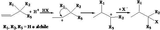 La regiochimica della reazione elettrofila è complicata da una reazione parassita che interessa i carbocationi, comunque generati: la reazione di trasposizione. Atomi di idrogeno o gruppi alchilici possono migrare verso il carbocatione portandosi dietro il doppietto di elettroni di legame, qualora la migrazione porti alla formazione di un carbocatione più stabile.