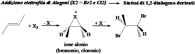 Reazione di addizione elettrofila trans-stereoselettiva a due stadi di alogeno molecolare. 1° Stadio (lento): formazione di un catione ciclico a 3 termini (ione alonio) e di uno ione alogenuro. 2° Stadio: attacco stereoselettivo da parte dello ione bromuro su un atomo di carbonio dello ione ciclico. L'attacco avviene dalla parte opposta rispetto a quella dell'atomo di alogeno già presente.