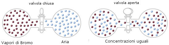 Analogamente possiamo spiegare anche i fenomeni di diffusione. E' infatti evidente che uno stato in cui le molecole di un fluido si trovano concentrate in uno spazio limitato risulta più ordinato di uno stato in cui le molecole occupano, in modo casuale tutto lo spazio a disposizione. Lo stato disordinato può essere ottenuto in un numero di modi maggiore ed è per questo motivo di gran lunga più probabile.