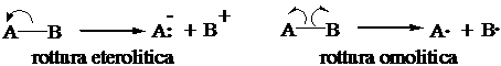 Un legame A-B può frammentare in due modi: per via eterolitica o omolitica. Nel primo caso gli elettroni di legame rimangono entrambi sull'atomo più elettronegativo; si generano due ioni, un anione A- e un catione B+.