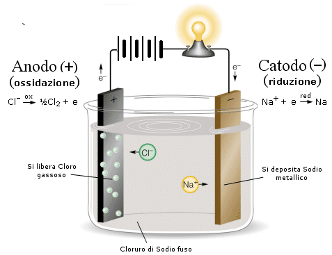 Se immergiamo due elettrodi collegati ad un generatore di corrente continua in un recipiente che contenga NaCl fuso (e quindi dissociato in ioni Na+ e Cl-), gli ioni Na+ vengono attratti dall'elettrodo negativo dove si riducono acquistando un elettrone, mentre gli ioni Cl- vengono attratti dall'elettrodo positivo al quale cedono il loro elettrone ossidandosi.