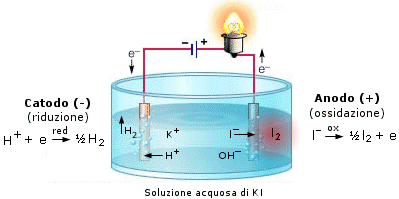Ad esempio se effettuiamo l'elettrolisi di una soluzione acquosa di ioduro di potassio, possiamo prevedere che all'anodo competeranno per la reazione di ossidazione sia gli ioni I- che gli ioni OH-, mentre al catodo si presenteranno gli ioni K+ e gli ioni H+.