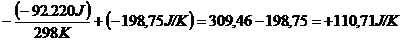 Come si può osservare, nonostante la trasformazione produca una diminuzione dell'entropia del sistema (-198,75 J/K) lasciandolo più ordinato, il calore ceduto all'ambiente durante la reazione aumenta l'entropia dell'ambiente stesso (+ 309,46 J/K) in misura talmente sensibile che l'entropia totale dell'universo (sistema + ambiente) è destinata ad aumentare ( + 110,71 J/K) durante la reazione.