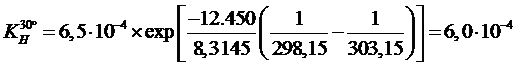 Calcolare la costante di Henry dell'Azoto in acqua a 30°C sapendo che il suo valore a 25°C è pari KH=6,5·10-4 mol L-1 atm-1 e l'entalpia standard di solubilizzazione vale DHsol = -12,45 kJ mol-1.