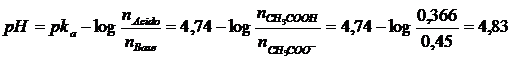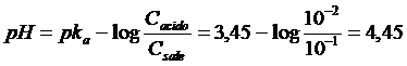 Per calcolare il pH di una soluzione tampone, usiamo l'equazione Henderson-Hasselbach (pka = -log 1,8 10-5 = 4,74)