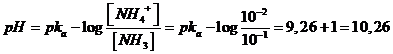 Costruiamo un tampone costituito da una soluzione NH3 10-1 M / NH4Cl 10-2 M, lo ione ammonio NH4+ rappresenta l'acido coniugato dell'ammoniaca Kb = 1,8 10-5 (ed ovviamente l'ammoniaca è la base coniugata dell'acido NH4+)