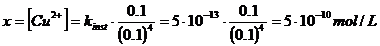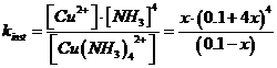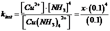 In questo caso la concentrazione del legante non è in eccesso rispetto a quella del catione. Possiamo allora ragionare in termini della reazione opposta, la dissociazione del complesso, che presenta una costante di instabilità pari a kinst =1/kf = 5 10-13. La massima quantità di complesso che si può formare in queste condizioni è pari alla concentrazione iniziale del catione Cu2+, il quale reagisce con 0,4 mol/L di NH3. Rimangono in soluzione 0.5 - 0,4 = 0.1 mol/L di NH3.