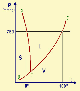 La curva TA rappresenta così la variazione del punto di fusione sotto l'effetto di una p esterna. Ovviamente, sopra al punto critico (temperatura critica 374°C, pressione critica 218 atm) non può esistere equilibrio liquido-vapore L-V, poiché l'acqua esiste solo allo stato vapore.