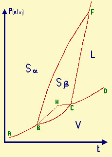 Fig.28.5 Diagramma di stato p/t per lo zolfo. B = punto triplo di coesistenza delle fasi Sa-Sb-vapore (p 0.01 mm Hg; T 95.5°C) C = punto triplo di coesistenza delle fasi Sb-liquido-vapore (p 0.025 mm Hg; T 119°C) F = punto triplo di coesistenza delle fasi Sa-Sb-liquido (p 1290 atm; T 151°C) H = punto metastabile (T 113°C) AB = curva corrispondente alla sublimazione di Sa BC = curva corrispondente alla sublimazione di Sb CD = curva corrispondente all'evaporazione dello zolfo liquido BF = curva corrispondente alla transizione solido-solido Sa-Sb CF = curva corrispondente alla fusione-soldificazione di Sb |