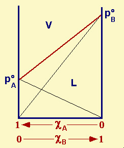 La pA, proporzionale alla frazione molare A, parte ovviamente da 0 quando A=0, e arriva a pA° quando A=1; pB, proporzionale a B, va in senso opposto.