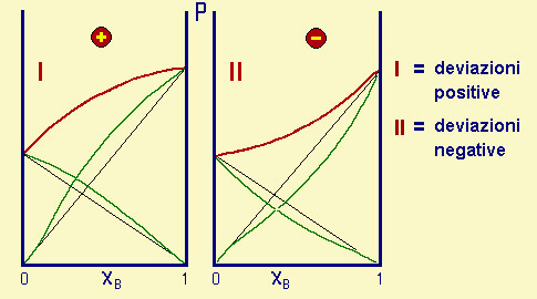 In realtà possiamo avere deviazioni positive (esempio I), quando le attrazioni A-B sono minori delle A-A e delle B-B: in tal caso, infatti, le molecole possono liberarsi più facilmente, creando perciò una p maggiore.