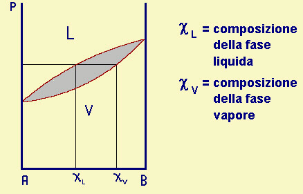Quando si parla di distillazione frazionata, si preferisce usare un diagramma isobaro anziché isotermo, dato che normalmente si opera a p atmosferica; in questo caso, invece delle tensioni di vapore, avremo le T di ebollizione. Il punto di partenza è lo stesso, ma, dato che a tensione di vapore più alta corrisponde temperatura di ebollizione più bassa, il diagramma presenta a sinistra B e a destra A (la frazione molare di B aumenta da sinistra a destra); inoltre, ovviamente, la zona in alto corrisponde alla fase vapore, quella in basso alla fase liquida.