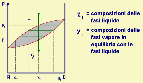 Fig.28.12 Diagramma isotermo che rappresenta la distillazione di una soluzione bicomponente in funzione della pressione. Il punto di partenza è indicato dal punto verde in alto, quello di arrivo dal punto verde in basso. A p=p1 la soluzione di composizione è in equilibrio col vapore di composizione y1; poiché questo è più ricco in B, la soluzione si impoverisce di B e la sua composizione segue gradualmente la curva verso sinistra, con una riduzione della p per l'evaporazione. Ad ogni composizione i della soluzione corrisponde una composizione yi del vapore; a p=p2 si ha totale evaporazione della fase liquida con composizione ; a questo punto il vapore ha la composizione |