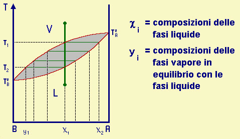 Fig.28.13 Diagramma isobaro della distillazione frazionata di un sistema bicomponente A-B. Il punto di partenza è indicato dal punto verde in basso, quello di arrivo dal punto verde in alto. TA° = temperatura di ebollizione di A puro TB° = temperatura di ebollizione di B puro Ti = temperatura di ebollizione delle soluzioni i La soluzione iniziale (e il vapore finale) ha composizione ; quando inizia la distillazione il vapore ha composizione y1; quando finisce, la soluzione ha composizione |