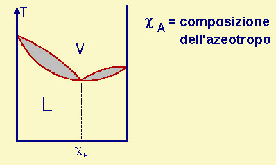 Fig.28.14 Diagramma isobaro di distillazione di un sistema binario A-B in cui A e B danno una miscela azeotropa di composizione A A destra e a sinistra della composizione azeotropica il comportamento è analogo a quello descritto in precedenza (come se il diagramma fosse costituito da due diagrammi a lente affiancati, uno con componenti A puro e A, l'altro con componenti A e B puro. Se però si cambia p, può cambiare la composizione azeotropica. |