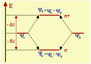 Fig.15.1 Schema energetico di formazione degli OM legante ed antilegante per la molecola H2. La differenza di energia ΔE dell'orbitale legante σ rispetto alla situazione degli OA è eguale, ma di segno contrario, rispetto a quella dell'orbitale antilegante σ*. Perciò l'energia totale non cambia. Lo stesso schema (ma con valori di E diversi) vale anche per una ipotetica molecola di He, dato che gli OA in gioco sono gli stessi. Abbiamo a disposizione 2 OA 1s; per combinazione lineare (somma o differenza degli OA) avremo i 2 OM legante σ e antilegante σ*. |