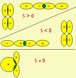 Fig.15.3 Integrali di sovrapposizione tra orbitali atomici diversi. Nella parte in alto del disegno, due esempi di sovrapposizione di orbitali p, con integrale superiore a zero, S>0: la densità elettronica fra i due nuclei aumenta (ψb) e si forma un legame. Nella parte centrale, due esempi di sovrapposizione di orbitali p, con integrale inferiore a zero, S<0: la densità elettronica fra i due nuclei diminuisce (ψa) e si forma un antilegame. Nella parte in basso, un esempio di sovrapposizione di un orbitale s con un orbitale p, con integrale eguale a zero, S=0: l'integrale positivo dovuto alla sovrapposizione delle due parti degli orbitali con segno eguale viene esattamente annullato dall'integrale negativo dovuto alla sovrapposizione delle due parti degli orbitali con segno opposto. Non esiste alcuna interazione; è una situazione di 'non legame'. |