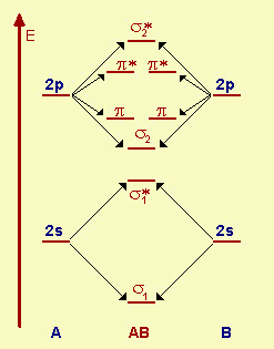 Poiché la sovrapposizione per i p perpendicolari all'asse è minore che per quelli coassiali (perciò i legami conseguenti provocano una minore stabilizzazione), la ΔE relativa a π-π* è minore che per σ2-σ2*.