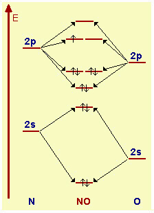 Fig.15.6 Schema energetico di formazione degli OM per la molecola di monossido di azoto, NO. Nella formazione della molecola NO partendo da un atomo O e un atomo N, gli OA di O sono a E più bassa, poiché O ha carica nucleare maggiore di N. L'ordine di legame risultante è di 2.5 (3 coppie di elettroni, indicati dalle coppie di elettroni con spin antiparalleli, negli OM di legame, 0.5 in quelli di antilegame π*, corrispondente all'elettrone sul primo orbitale di antilegame π*. Questo avviene poiché il sistema ha 11 elettroni (6 per O, 5 per N). L'ordine di legame sarebbe invece 2 per NO- (12 elettroni); un secondo elettrone a spin spaiato occuperebbe infatti il secondo orbitale di antilegame π*. L'ordine di legame sarebbe 3 per NO+ (10 elettroni); in questo ione, infatti, nessun elettrone si troverebbe negli orbitali di antilegame π*. |
