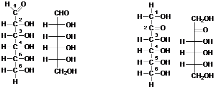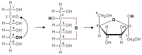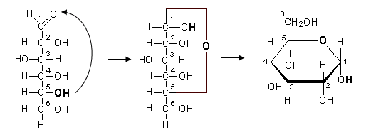 In realtà gli esosi si chiudono ad anello poichè il gruppo carbonilico reagisce con l'ossidrile in C formando un esagono (con l'ossigeno che fa da ponte tra C e C