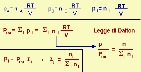 Nel trattare il comportamento del gas ideale e dei gas reali, abbiamo finora sempre considerato una sola specie chimica; ma se il sistema è costituito da una miscela di due o più gas che occupano lo stesso volume V, identificando ogni singola specie gassosa con i simboli A, B, ..i e considerando che tutti si comportino come gas ideali, ognuno di essi seguirà la legge generale.