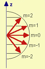 Fig.7.1 Orientazioni del vettore rispetto ad un campo. I valori possibili rappresentano le proiezioni del vettore momento angolare lungo la direzione del campo magnetico e possono essere soltanto: m= -l, -l+1, -1, 0, 1, l-1, l Per esempio, per l=2, le possibilità sono cinque, con orientazioni corrispondenti a m = -2, -1, 0, +1, +2. Le proiezioni lungo la direzione z potranno assumere perciò i valori: (per m=0) ±h/2π (per m=±1) ±2 h/2π (per m=±2) |