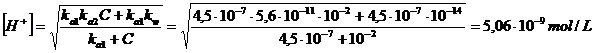Consideriamo ad esempio una soluzione di Idrogeno Carbonato di Sodio NaHCO3 di concentrazione C = 10-2 M. In soluzione è completamente dissociato in C ioni Na+ e C ioni HCO3-. L'acido carbonico H2CO3, essendo un acido debole biprotico, presenta due costanti di dissociazione pari a ka1 = 4.3 10-7 e ka2 = 5.6 10-11.