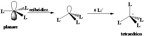 Numero di coordinazione 4 (tetraedrica). L'orbitale pz0 può essere utilizzato per formare un nuovo legame s con un legante che ha un orbitale contenente un doppietto di elettroni. All'atto della formazione del nuovo legame si ha una reibridizzazione 3(sp2)1 pz0 3(sp3)1 1(sp3)0. Gli orbitali sp3 sono diretti verso i vertici di un tetraedro, distanziati tra loro di 109°.