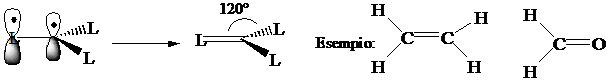 Numero di coordinazione 3 (planare). Ibridizzazione s1px1 py1 pz0 3(sp2)1 pz0 : formazione di tre legami s con tre leganti L. I legami giacciono su un piano distanziati di 120°.