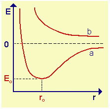 Fig.14.1 Valore dell'energia di un sistema di due atomi in funzione della loro distanza r. La curva a corriponde alla formazione di un legame. La curva b corriponde ad una situazione di repulsione tra i due atomi e non si ha formazione di legame; succede, per esempio, se tutti gli orbitali atomici sono pieni. E0 = energia di legame r0 = distanza di legame Il valore 0 per E corrisponde all'energia dei due atomi a distanza infinita: perciò E0 è negativa e rappresenta una energia di stabilizzazione. |