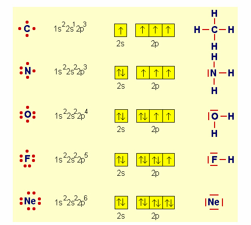 Vediamo come si può rappresentare una situazione di legame covalente (o di 'non legame' nel caso di Ne) in modo simbolico; consideriamo, per esempio, C, N, O, F e Ne. Possiamo indicare le varie situazioni con vari tipi di notazioni, già viste: