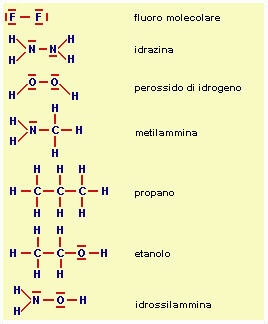 Fig.14.3 Esempi di molecole rappresentate con la notazione di Lewis. Ogni trattino rosso corrisponde a una coppia di elettroni; se congiunge due atomi corriponde a un legame covalente; in caso contrario, se compare cioè 'appoggiato' su un atomo, si tratta di un doppietto libero. Gli atomi presenti hanno sempre la stessa covalenza: 1 per H ed F; 2 per O; 3 per N; 4 per C. Tutti i legami sono legami semplici, cioè con una sola coppia di elettroni in comune. Alcune molecola hanno nomi convenzionali, come idrazina e propano. Il perossido di idrogeno è più comunemente noto come acqua ossigenata e contiene un legame perossidico, relativamente instabile, quello tra i due O. |