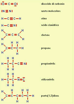 Fig.14.4 Esempi di molecole con doppi e tripli legami. Il diossido di carbonio è comunemente noto come anidride carbonica; i tre atomi giacciono sulla stessa linea. L'etino è noto come come acetilene; i quattro atomi giacciono sulla stessa linea. Anche nell'acido cianidrico i tre atomi giacciono sulla stessa linea. Il chetene ha due doppi legami adiacenti e i tre atomi di carbonio giacciono sulla stessa linea; non sono molte le molecole che hanno questa struttura. Propionitrile ed etilisonitrile sono isomeri dato che la formula minima è la stessa (sono costituiti dagli stessi tipi e dallo stesso numero di atomi), pur avendo proprietà molto diverse. Il penta(1,3)diene è detto anche (1,3)pentadiene, in cui i numeri rappresentano il primo C da cui parte ogni doppio legame, e diene significa che ci sono due doppi legami (di-ene). |