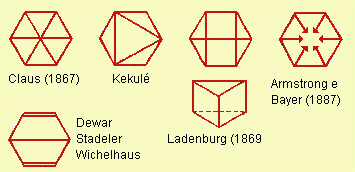 Fig.14.7 Strutture del benzene ipotizzate da Claus, Kekulé, Armstrong e Bayer, Dewar, Stadeler e Wichelhaus, Ladenburg. Ognuna delle rappresentazioni cercava di giustificare, con strutture anche fantastiche (dal punto di vista chimico), i dati sperimentali sul comportamento e sulle caratteristiche del benzene. Ogni tratto corrisponde a una coppia di elettroni, salvo che nella raffigurazione di Armstrong, nella quale le freccette corripondono a 1 elettrone ognuna. |